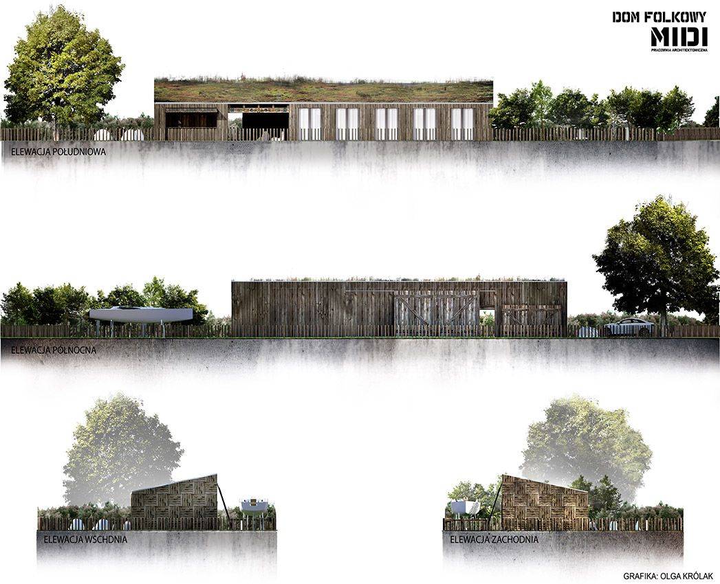 - Układ desek na krótszych elewacjach jest interpretacją tradycyjnego sposobu zdobienia szczytów domów w rejonie łowickim. Elementy folkloru łowickiego zostały wykorzystane również na elewacji południowej.