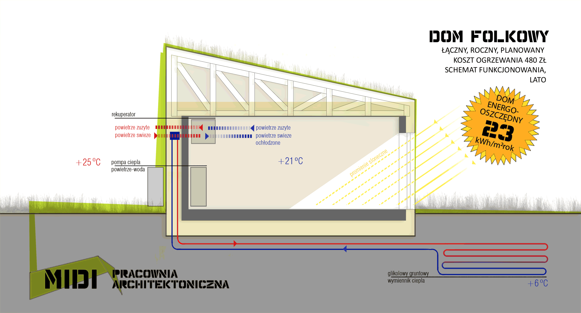 - jest tani w budowie (posiada prosty układ konstrukcyjny) oraz tani w użytkowaniu (ma bardzo niskie zapotrzebowanie na energię- energia potrzebna do ogrzania tego domu to zaledwie 20kWh/m2 na rok)