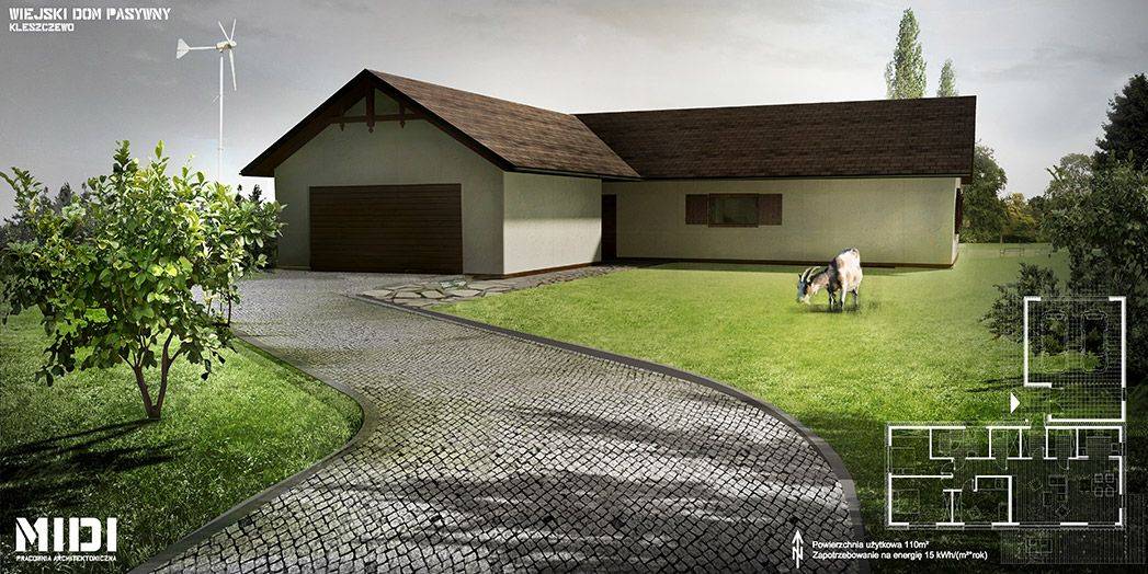 Ten dom to dowód na to, że można połączyć nowoczesne energooszczędne rozwiązania, jakie w sobie kryje, z tradycyjnym wyglądem. Życzeniem inwestora było, aby był to niewielki domek, nie różniący się od typowej wiejskiej zabudowy Kleszczewa. Można się domyśleć , że jest to dom pasywny (jego zapotrzebowanie na ciepło to 10% zapotrzebowania typowego domu) jedynie po braku komina. No chyba że mamy wgląd w rachunki...